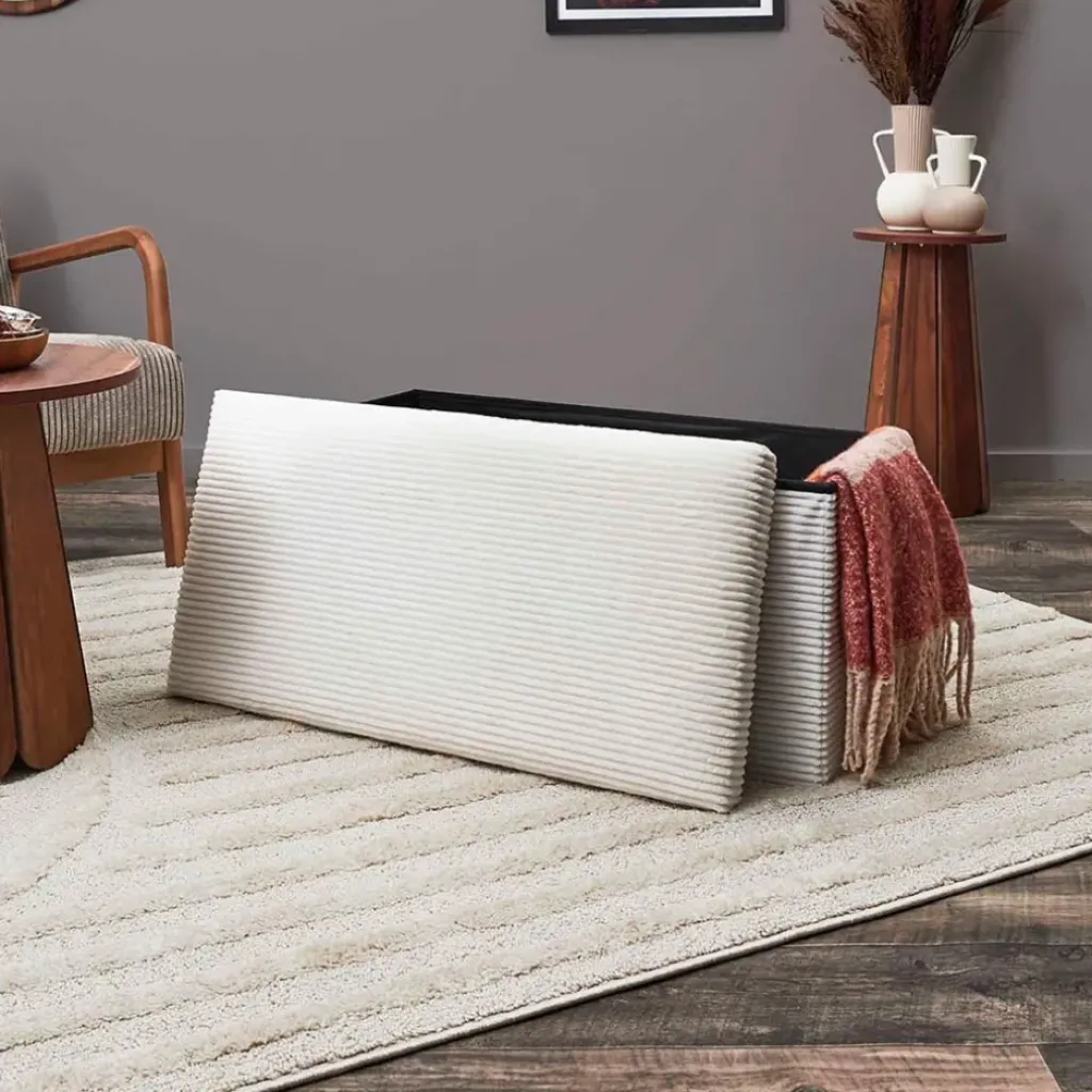 Découvrez le banc coffre pliable en tissu côtelé beige de la collection Scarlett, une solution intelligente pour optimiser l’espace dans votre maison.