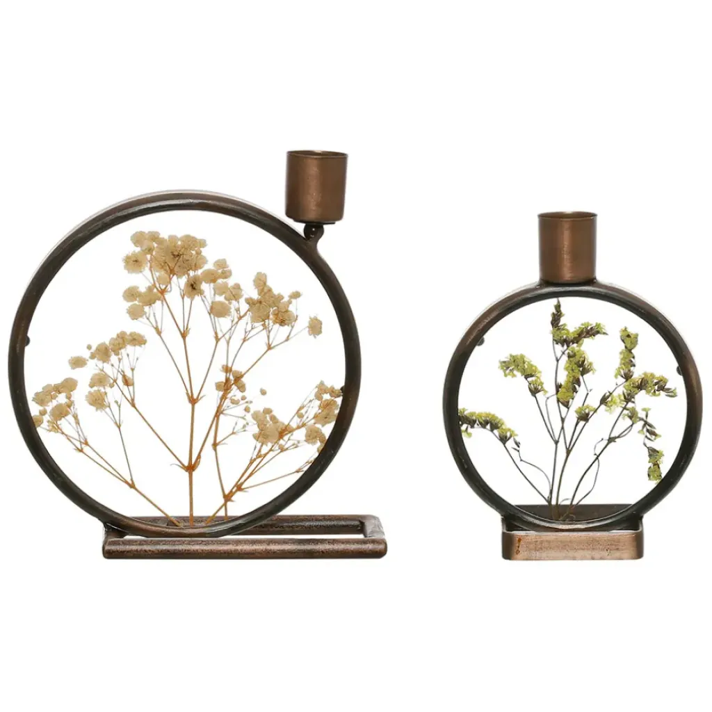 Découvrez notre ensemble de deux bougeoirs en fer, ornés de délicates fleurs séchées, pour une touche naturelle et authentique dans votre intérieur.