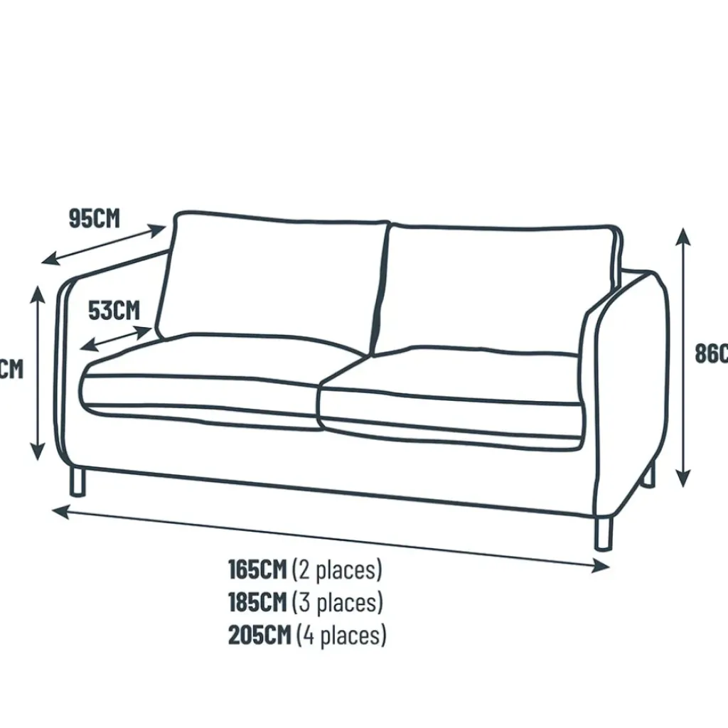 Assise: Coussins non déhoussables indépendants en mousse PE 28 Kg/m3 et fibre polyester.