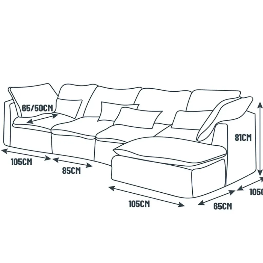 Le canapé est composé de 5 modules : 2 chauffeuses, 2 pièces d’angles et 1 pouf.Structure : La structure du canapé « Auguste » est principalement composée de panneau de particules, qui est un matériau composite utilisé couramment dans la fabrication de meubles, et de pin massif, qui est du bois massif de pin.