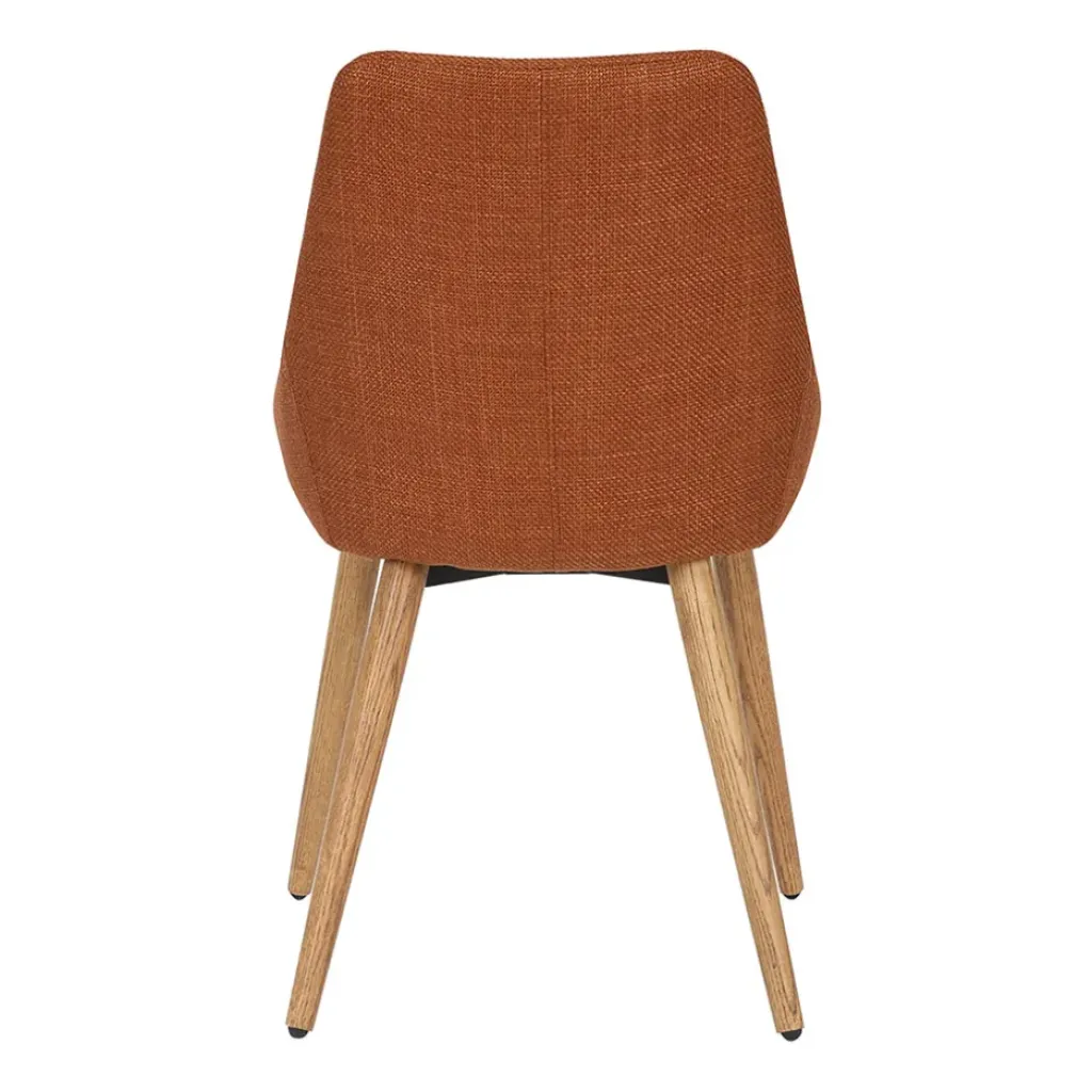 Avec son revêtement en tissu cognac et ses pieds en chêne foncé, cette chaise apporte une touche de chaleur et de caractère à votre espace repas.