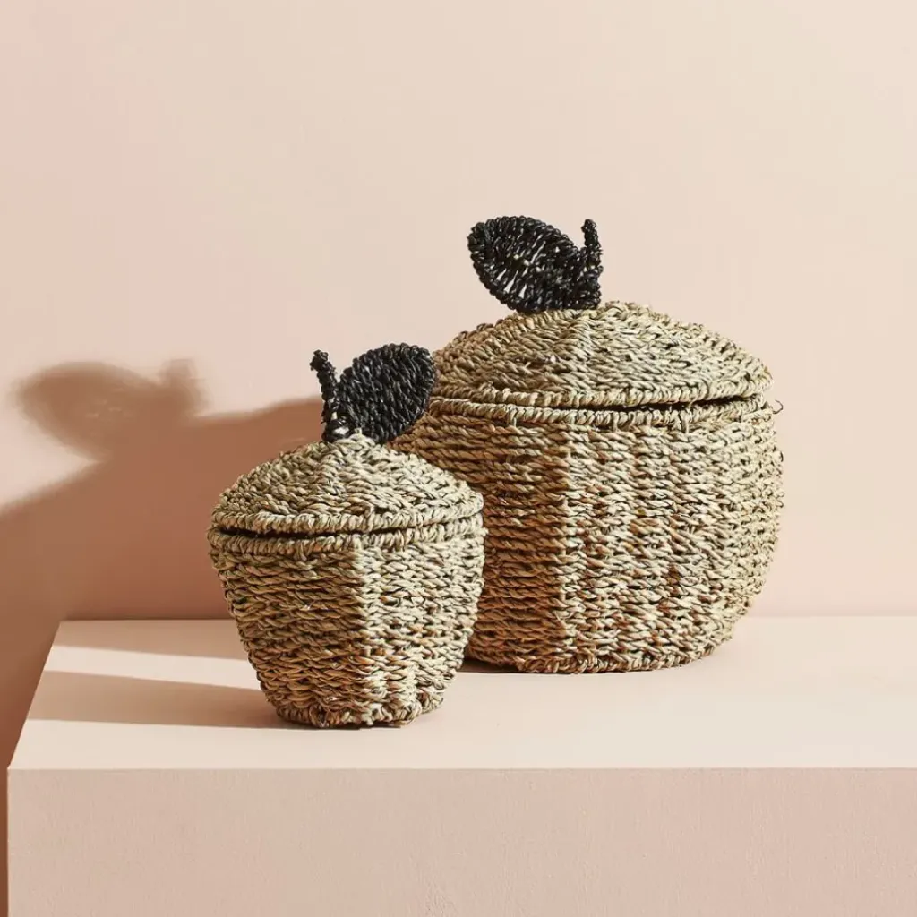 Découvrez nos Corbeilles à pommes Sweet Dream, un duo naturel en jonc de mer et fer avec couvercle.