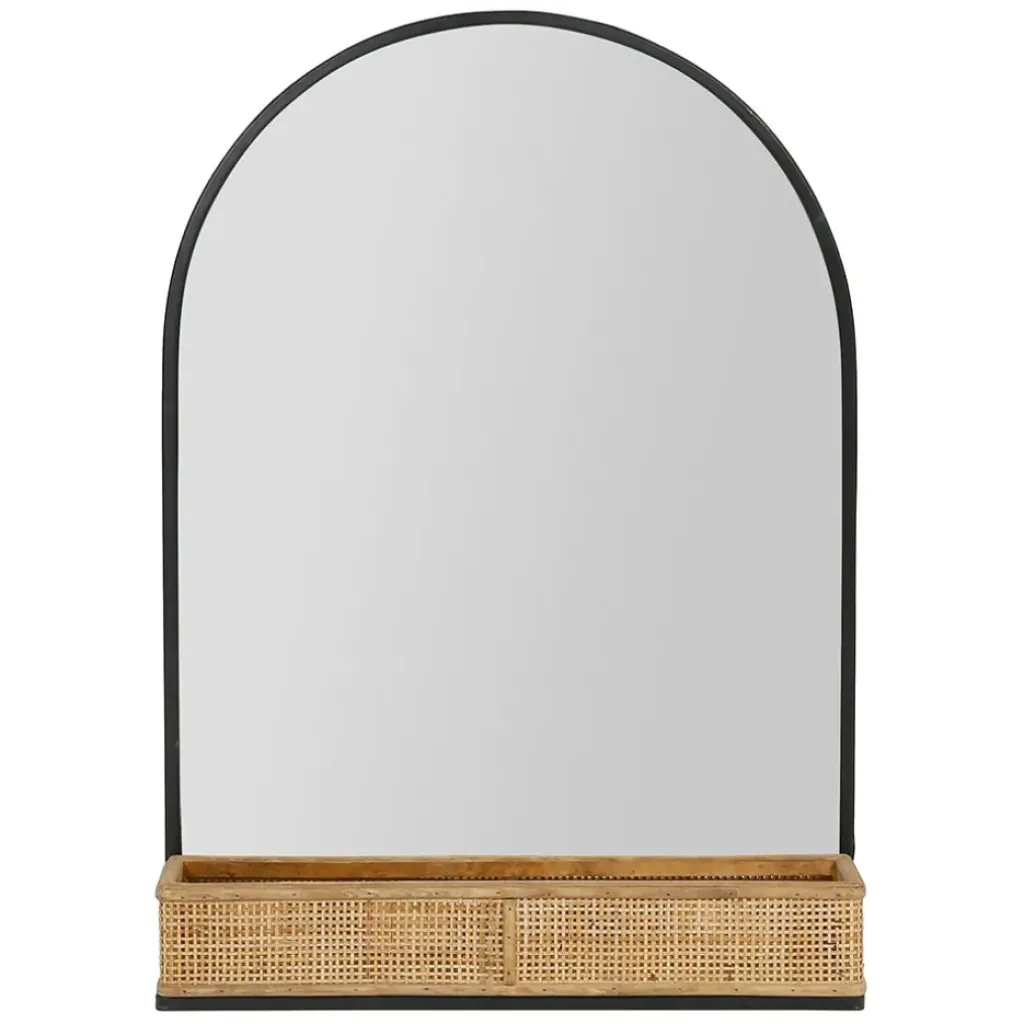 Ajoutez une touche moderne et fonctionnelle à votre espace avec notre miroir en fer noir aux lignes arrondies, accompagné d’une étagère en bambou naturel.