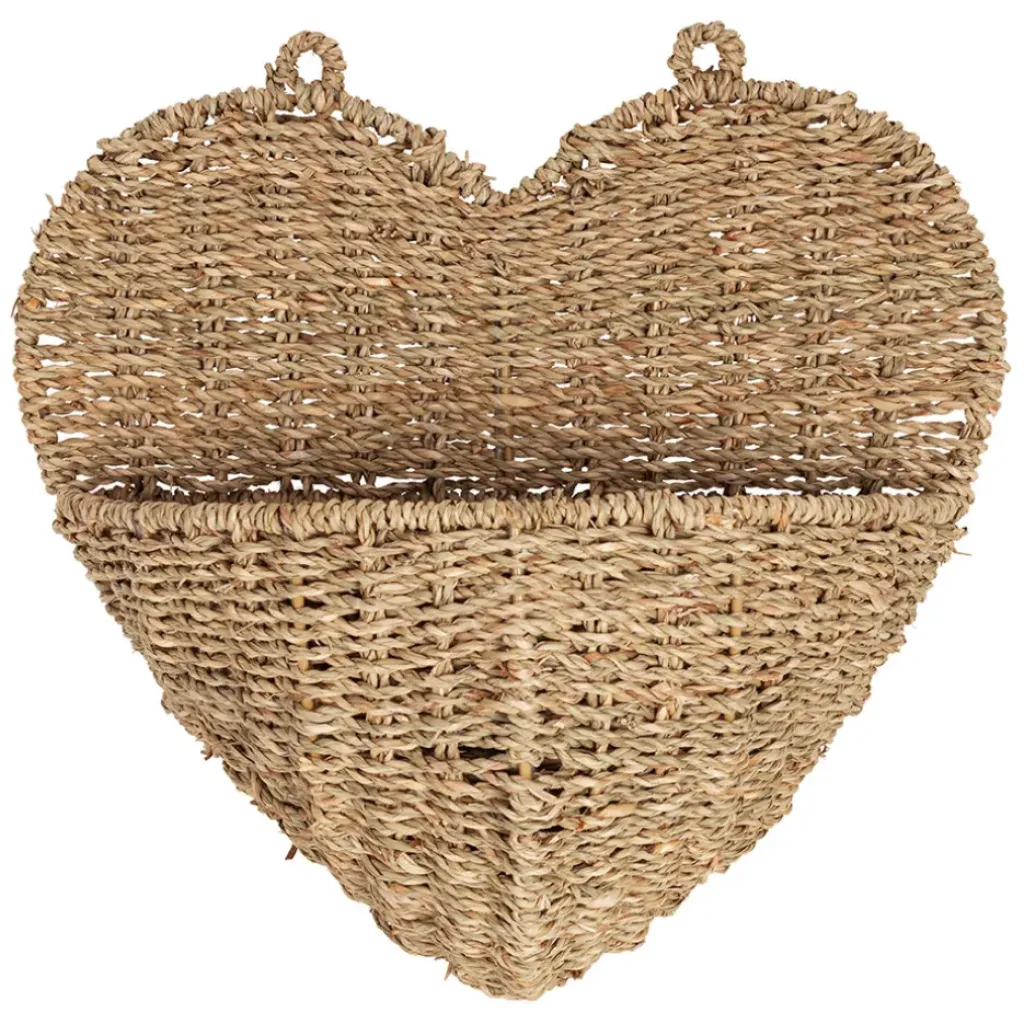 Découvrez ce magnifique panier en forme de cœur, réalisé en chaumière naturelle, mesurant 33x32cm.