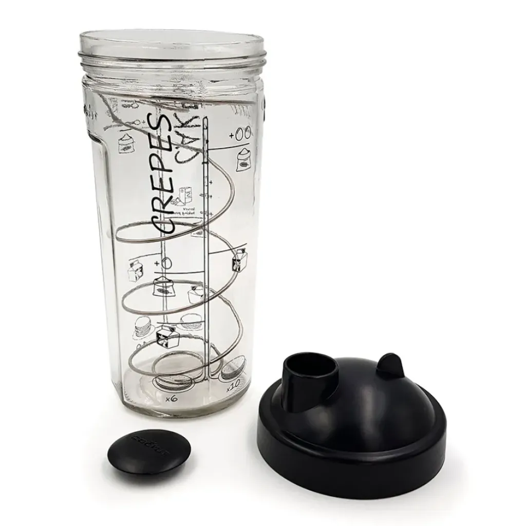 Shaker à crèpe, pancake et gauffre. Les crèpes faciles, sans recette, sans robot, sans balance, sans fouet, sans saladier ni louche. Ajoutez les ingrédients selon la recette inscrite sur le bocal, secouez, versez directement dans la poêle. Verre, bambou, métal