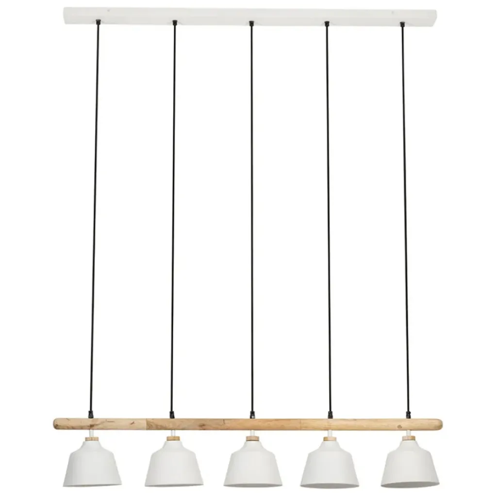 Découvrez l’alliance parfaite entre design contemporain et matériaux naturels avec cette suspension équipée de cinq lampes, mélangeant habilement le fer et le manguier blanc.