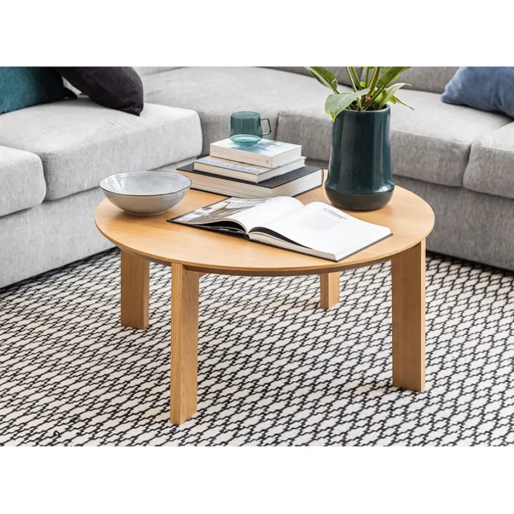 Une table basse de style classique, mais avec une touche contemporaineclassique – remarquez bien comment les pieds rectangulaires atteignent le haut de la table pour se marier avec plateau, un détail qui fait toute la différence.