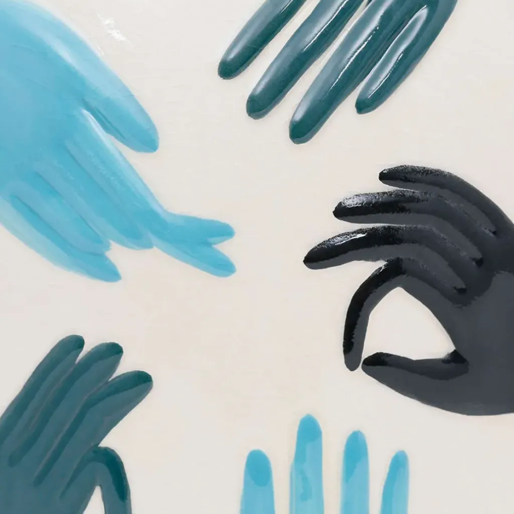 Ce vase en porcelaine arbore une audacieuse teinte bleue et se distingue par son design original illustrant une main et un visage.