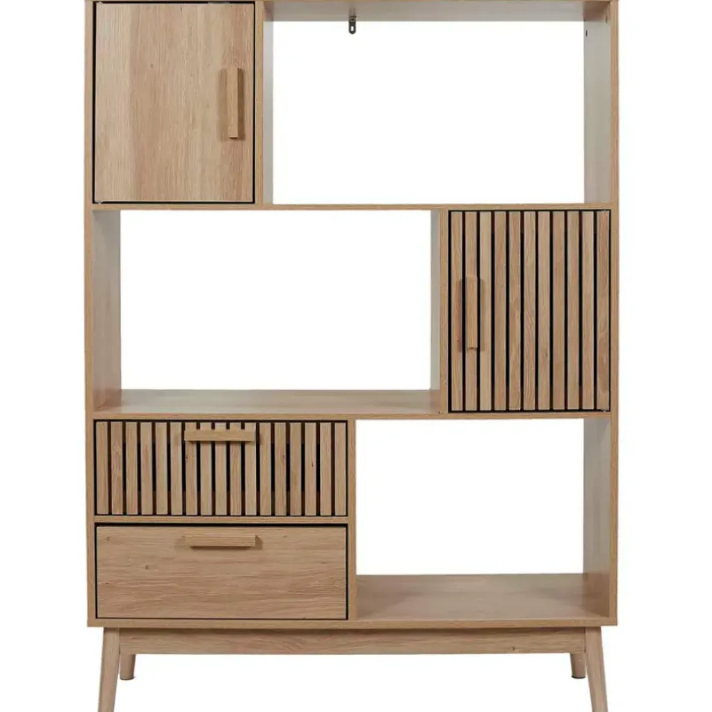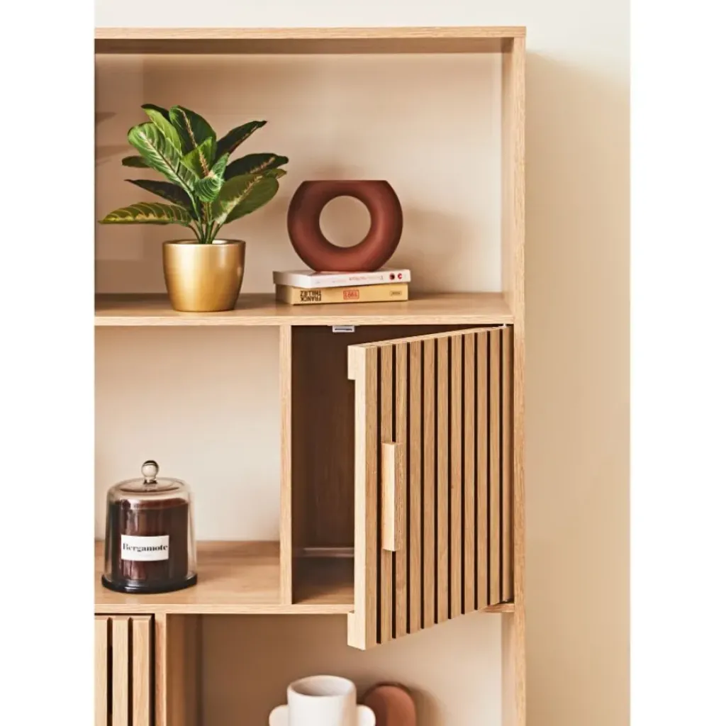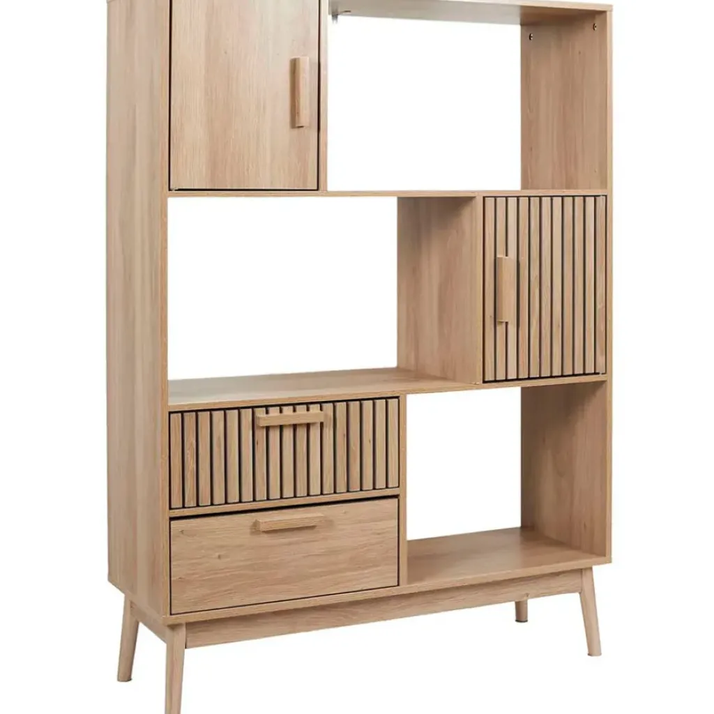Apportez une touche rétro et naturelle à votre salon avec la bibliothèque Kara en bois naturel.