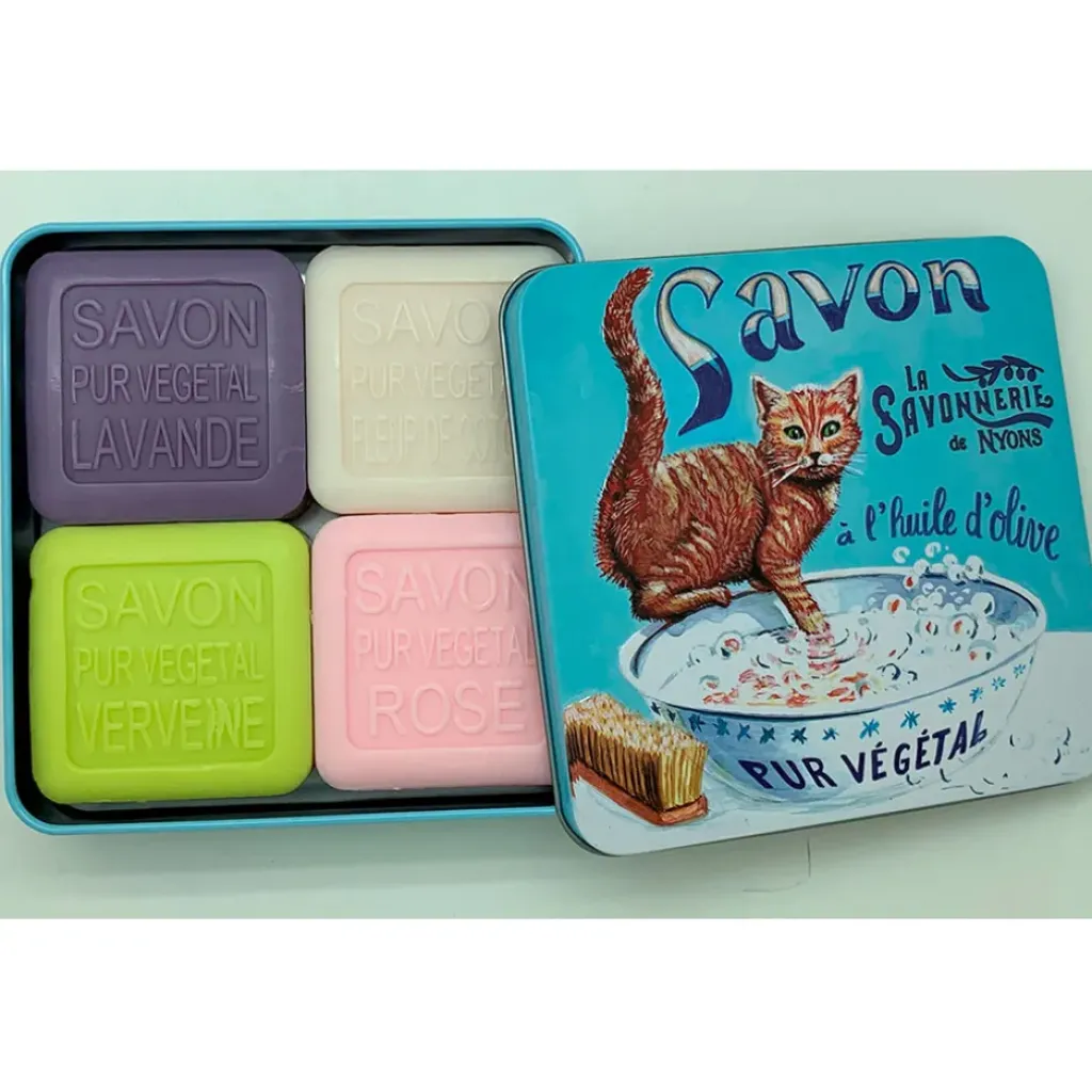 Découvrez notre boîte métallique unique contenant quatre adorables savons en forme de chat roux, un choix parfait pour les amoureux des félins et des soins de la peau.