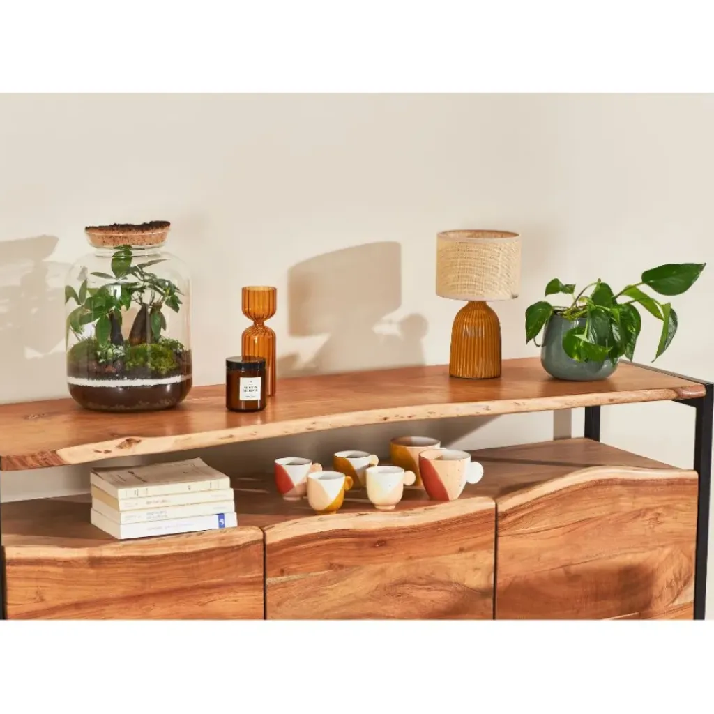 L’acacia apporte une touche de chaleur et de caractère, tandis que les pieds en fer noir ajoutent une note industrielle et contemporaine.