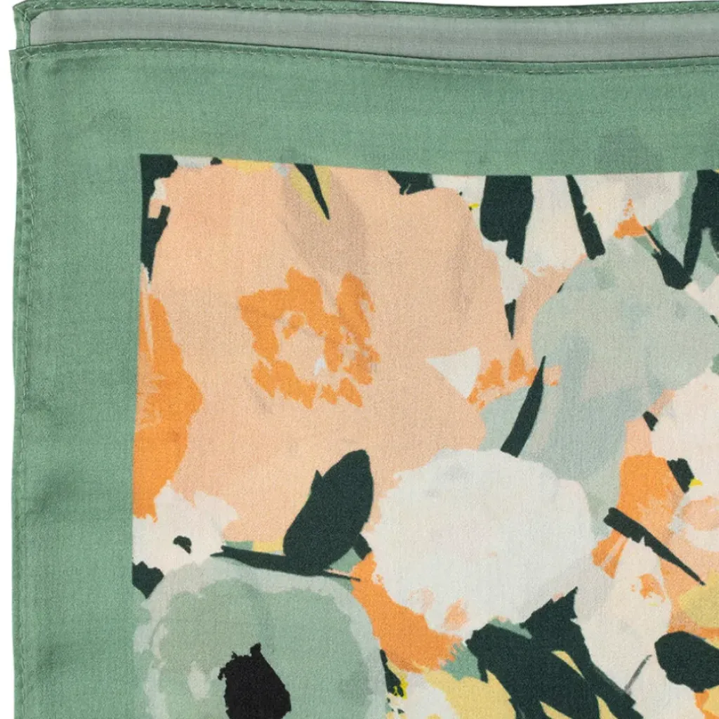 Ce foulard en soie naturelle se distingue par sa délicatesse et ses tons doux, qui évoquent la beauté florale d’un jardin en fleur.