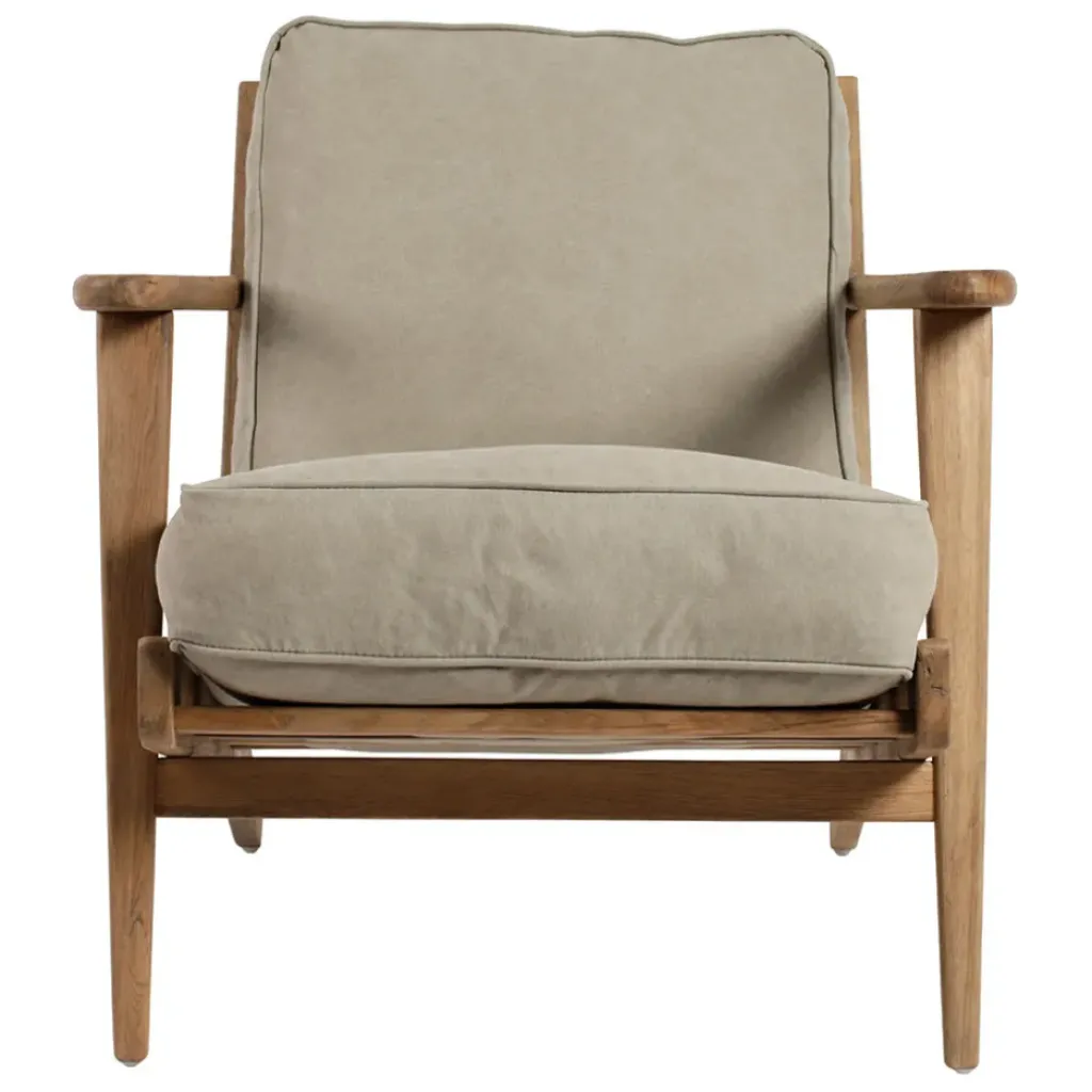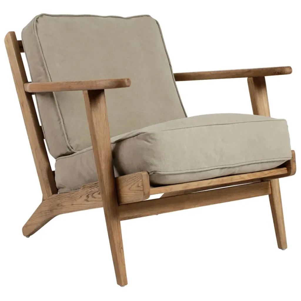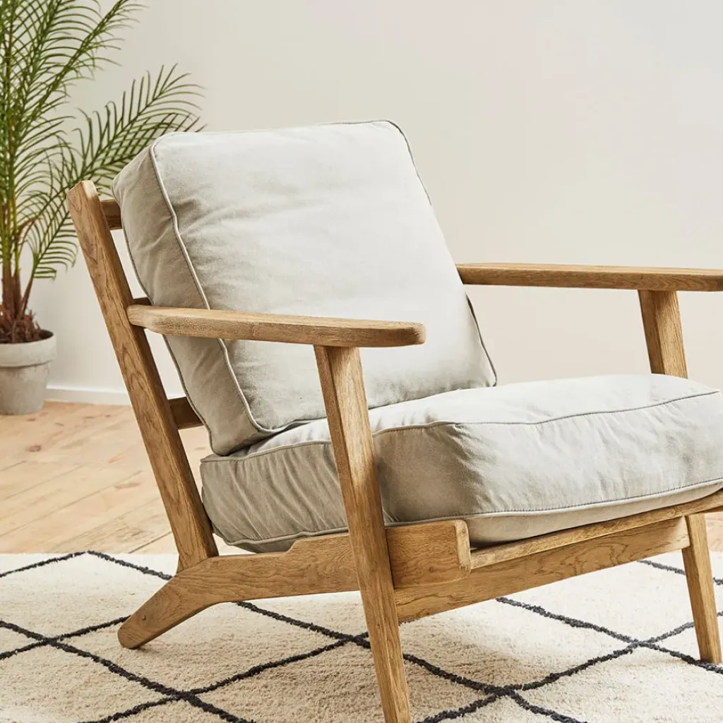 Succombez au fauteuil Laureli, véritable fauteuil design en bois et en tissus. Vous allez craquer pour ses lignes et la noblesse des matériaux utilisés : le chêne pour les accoudoirs et les pieds et le coto gris taupé pour les coussins.