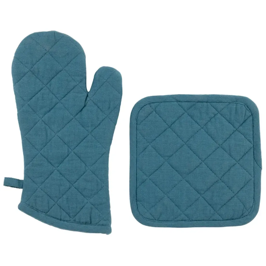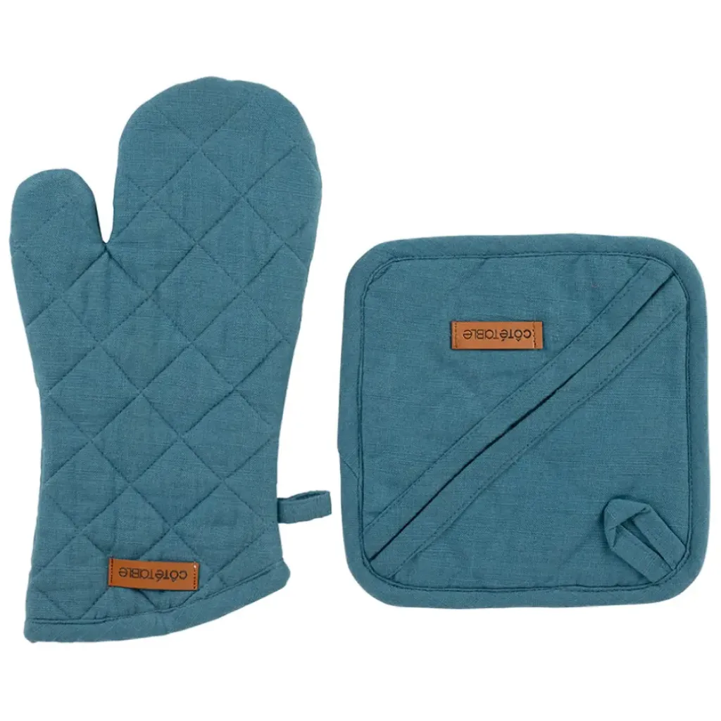 Découvrez le charme et la fonctionnalité de nos accessoires de cuisine indispensables : le gant et la manique en coton de couleur bleu de Prusse.