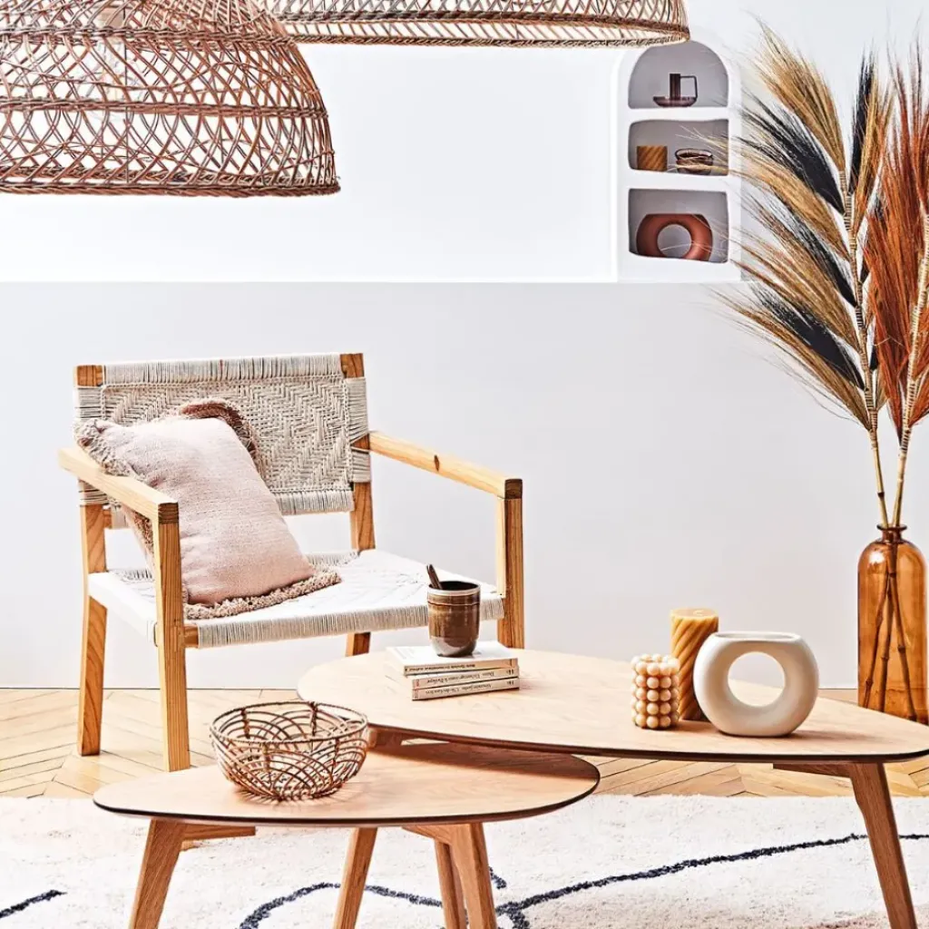 Découvrez la table basse gigogne en chêne naturel Becka, parfaite pour un salon à la décoration scandinave ou bohème.