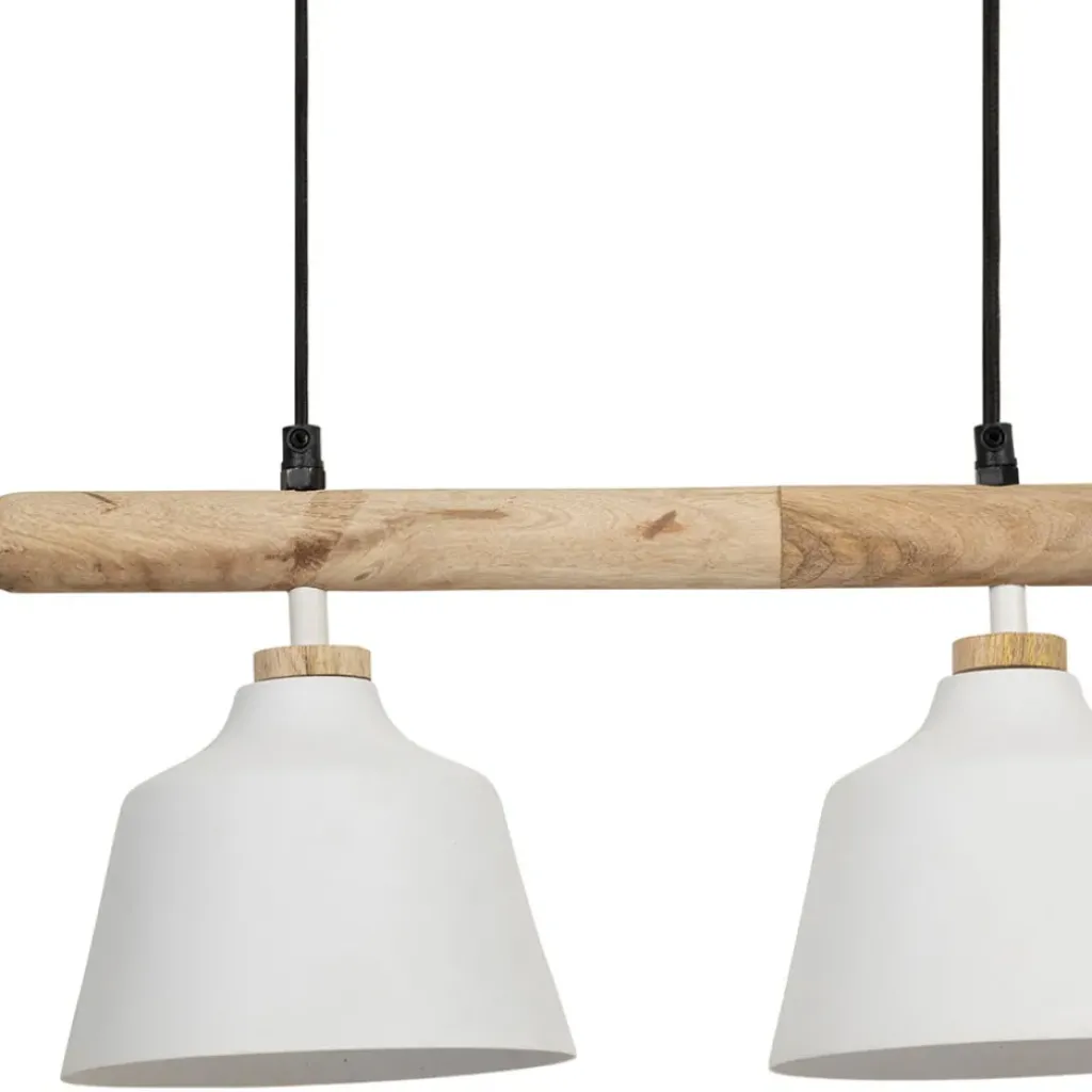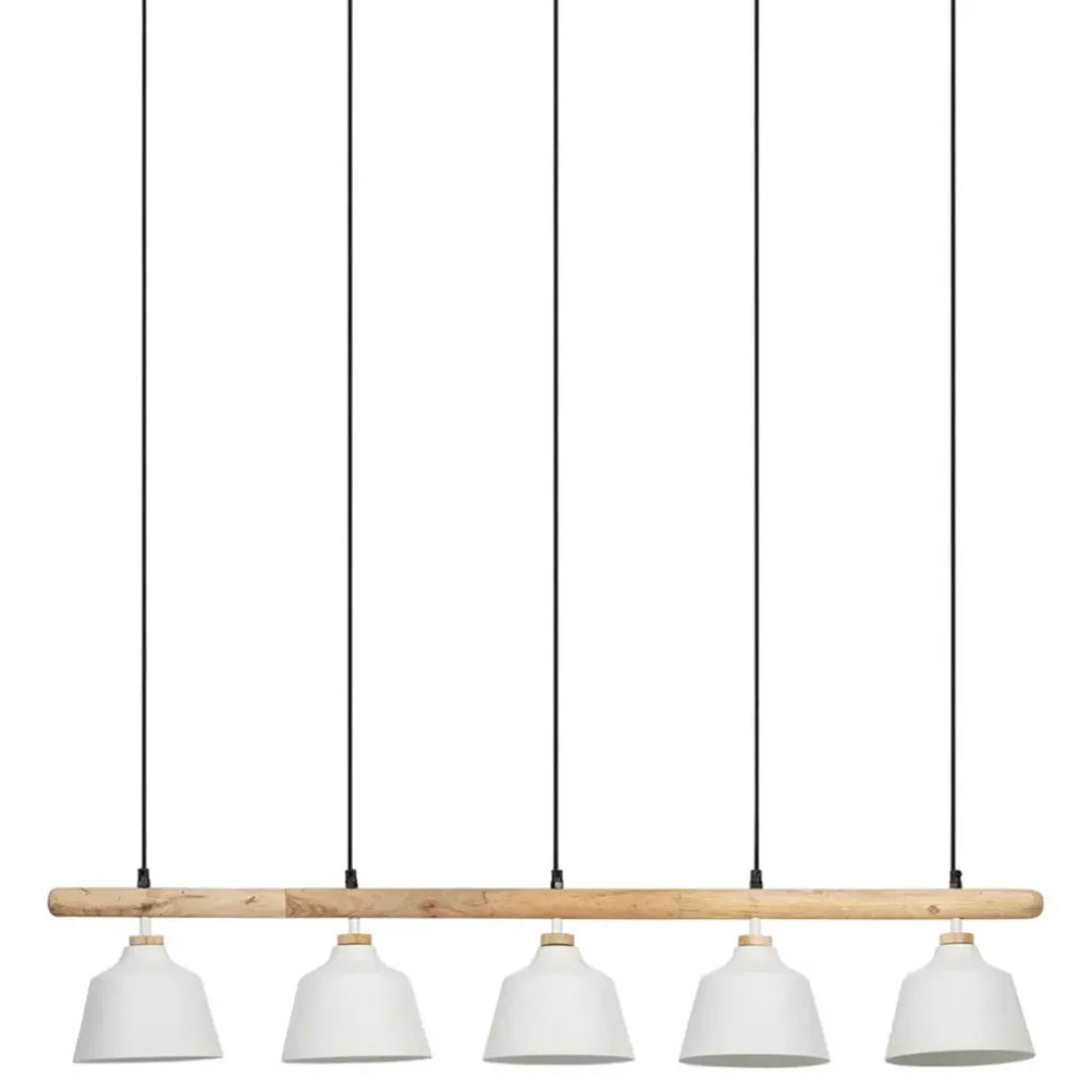 Découvrez l’alliance parfaite entre design contemporain et matériaux naturels avec cette suspension équipée de cinq lampes, mélangeant habilement le fer et le manguier blanc.