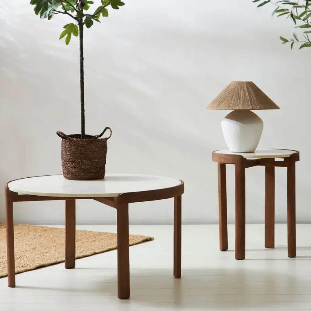 Découvrez la table basse ronde en manguier et marbre naturel et blanc d80cm – Agate.