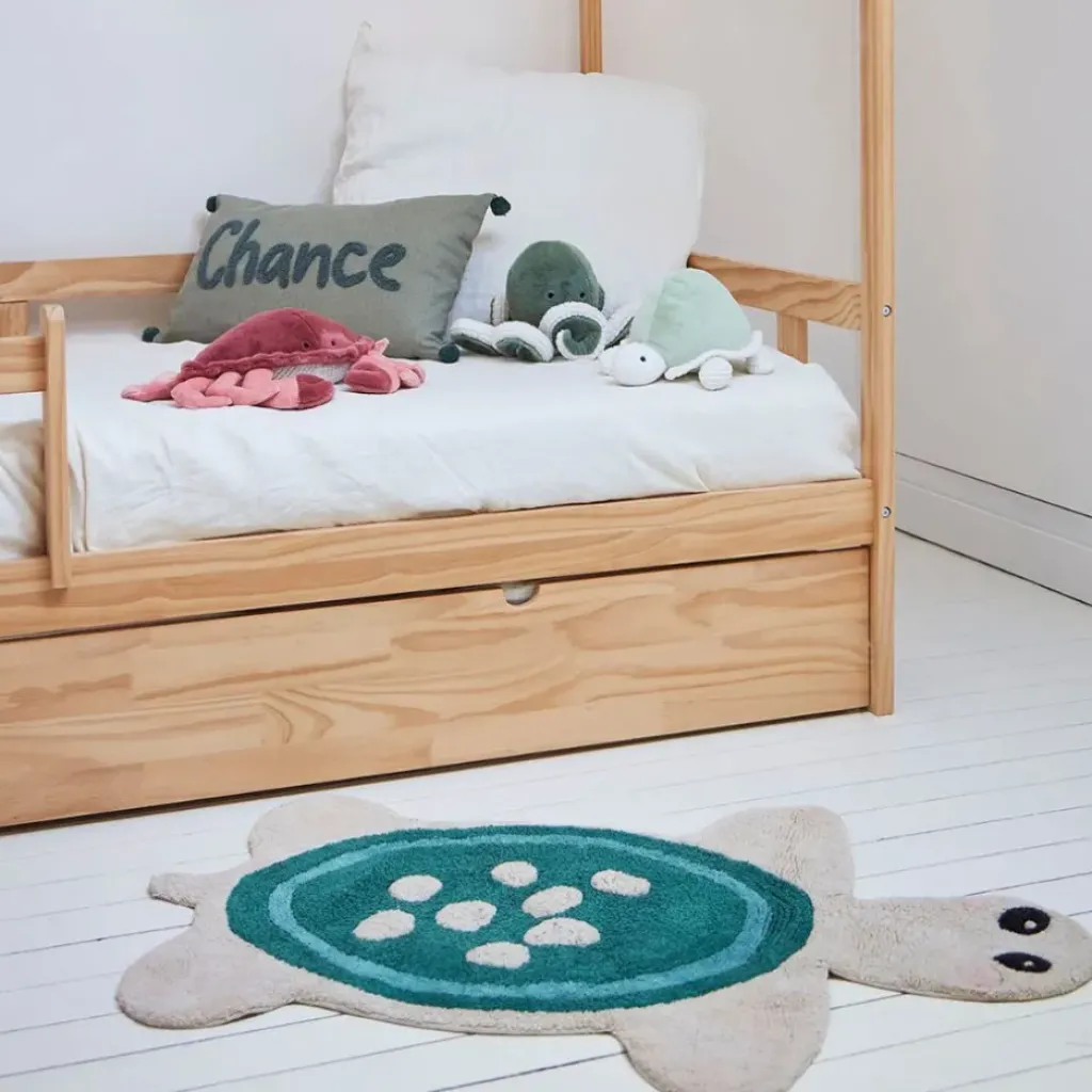 Ajoutez une touche de magie marine à la chambre de votre enfant avec le tapis tortue en coton tufté écru et bleu.